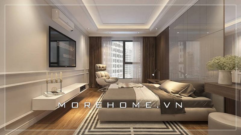 Mẫu thiết kế nội thất phòng ngủ chung cư hiện đại và sang trọng, tủ quần áo kịch trần, kệ ti vi treo tường là sự lựa chọn hoàn hảo của gia chủ tại không gian này