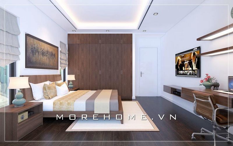 Morehome gợi ý cho bạn mẫu phòng ngủ Master tại biệt thự hiện đại, chiếc giường ngủ bọc nỉ cao cấp kết hợp ghế đuôi giường tạo sự thuận tiện nhất cho gia chủ