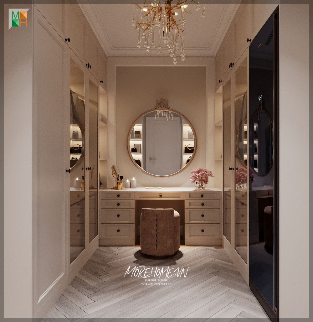Thiết kế hệ tủ áo phòng thay đồ hiện đại gỗ công nghiệp kết hợp cánh kính cho phòng ngủ master tông màu trắng.