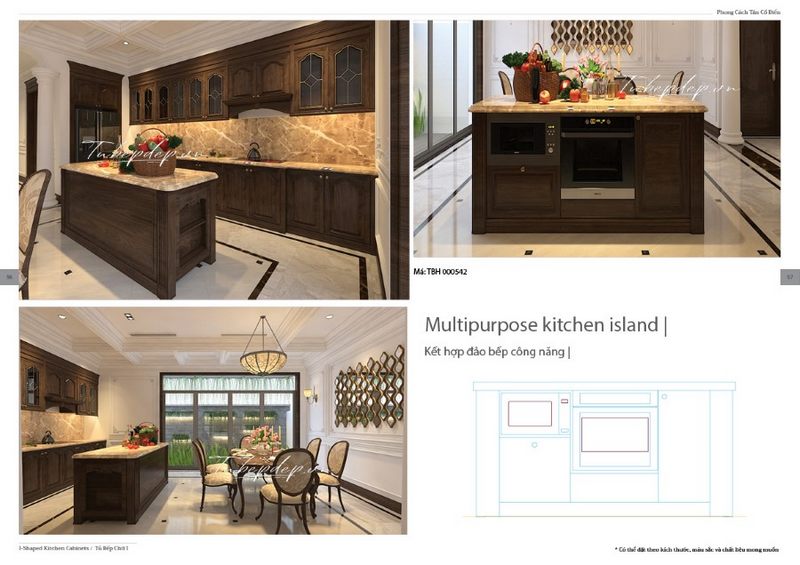 Đảo bếp từ gỗ óc chó được điêu khắc tỉ mỉ mang đặc trưng phong cách tân cổ điển có mặt bàn bếp bằng đá tự nhiên tiện lợi nấu nướng, vệ sinh lại tăng tính thẩm mỹ